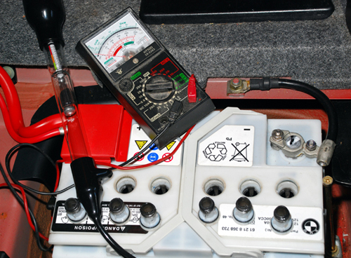 Also take hydrometer readings of each cell. With a fully-charged battery these should read between 1275 and 1300 (the specific gravity, or density, when compared to distilled water at 1000). If your battery is under the bonnet, the readings will be lower when hot, but a single lower reading indicates a dying cell. Suitable hydrometers are readily available from Halfords etc. and are also handy for topping up the cells.