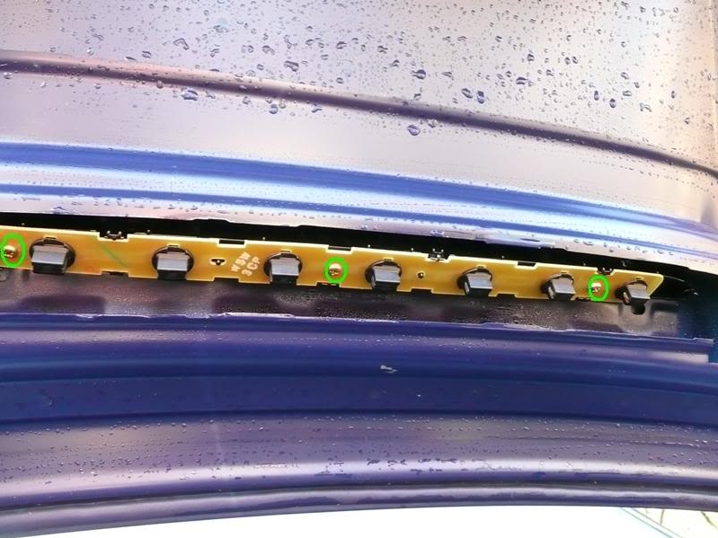 The PCB which powers the individual brake lights is held in place by 3 x Phillips screws -take your Phillips screwdriver and remove these (highlighted in green circles in below pictures to show location):