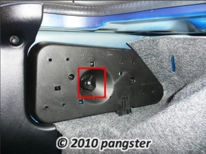 Twist the plastic locking bolt anti-clockwise – once unscrewed you can pull the assembly back (note that the plastic bolt does not come completely away from the unit) – you can lift up the rear carpet to allow you to lengthen the wiring room slightly if required: