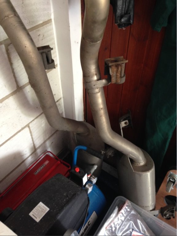 Step 2: Once you are happy the car is safe and not wobbly slide yourself under and start looking around making mental notes of the order you going to do things. Next is the exhaust pipes, The z3m has a twin exit exhaust system so both sides need removing. Whilst i was under there, its worth noting i had a custom exhaust set-up so the rubber mounts had very large hooks stopping it falling off. It was far easier removing the whole mount from the bottom of the car. If my memory serves me well its a single 13mm nut and bolt. Also at the rear there is two brackets behind the bumper on each exhaust, i noticed when i removed this each bracket had two washers under each bracket. In the photo you can see the exhaust mounts. I have also included a photo with the exhausts removed showing how the car is sat on the stands.